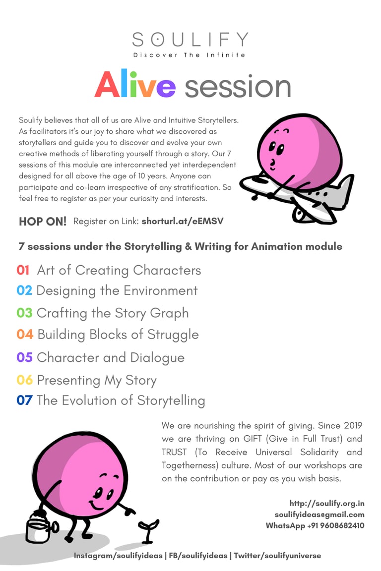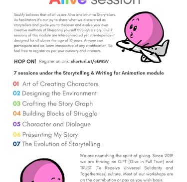 In our week-long Alive Sessions, participants journey from learning to create a unique character, to sculpting its evolutionary story arc, and finally to presenting their story live online. Experience the joy of imaginative storytelling, personal expression, and deep human connection - all in a supportive and inspiring virtual environment. Reach out to us to explore the full program and bring this transformative week to your community.