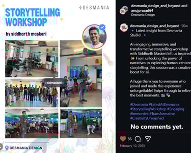 Our corporate trainings are immersive, human-centered experiences designed to help teams pause, reflect, and reconnect—with themselves and with one another. Using storytelling, play, and creative processes, we facilitate creative thinking, shared envisioning, and deep team bonding. These workshops are conducted with small groups of 10 to 50 participants and are thoughtfully designed for senior management and executives, creating safe spaces for dialogue, empathy, and collaboration. We have facilitated such sessions with organizations including Desmania Design (Gurgaon), Citrus Ink Studios (Delhi), and Vaibhav Studios (Mumbai), where teams explored new ways of working together while nurturing workplace happiness and trust.